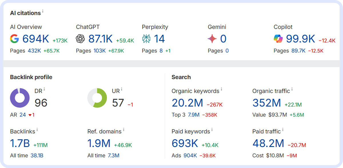 Ahrefs overview for Amazon: DR 96, 20.2M organic keywords, 352M monthly traffic, 1.7B backlinks