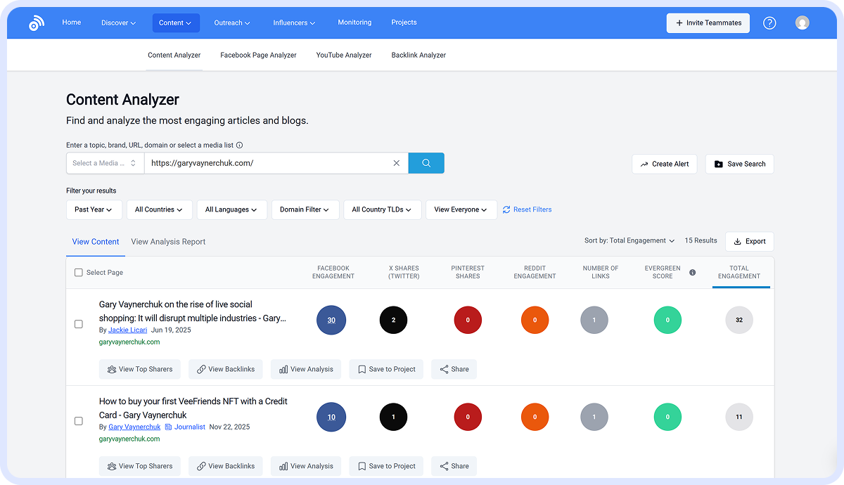 BuzzSumo Content Analyzer showing engagement metrics for garyvaynerchuk.com articles with Facebook, Twitter, and Pinterest share counts