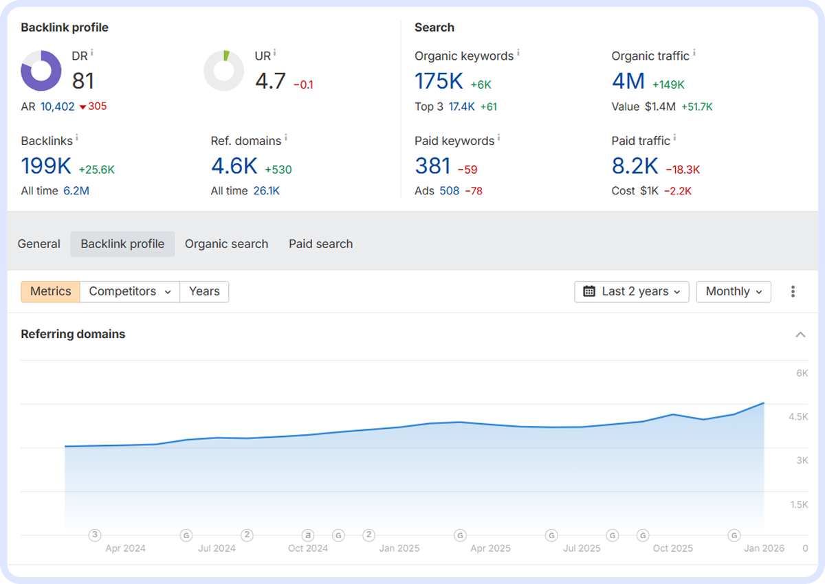 Ahrefs overview: DR 81, 175K organic keywords, 4M monthly traffic, 199K backlinks