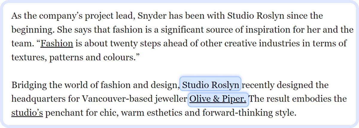 Article text excerpt with embedded hyperlinks to Fashion, Studio Roslyn, Olive & Piper, and other related terms