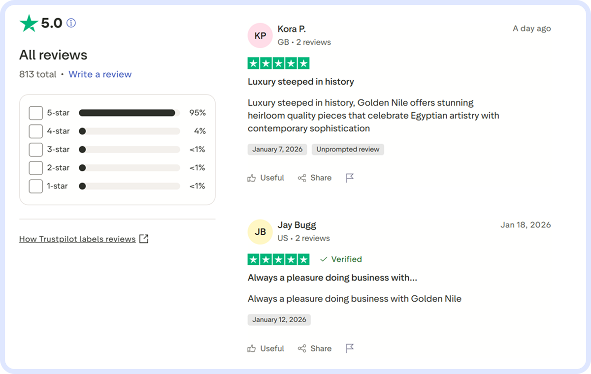 Trustpilot page showing Golden Nile's 5.0 rating with 813 reviews, 95% being 5-star, displaying two recent positive reviews